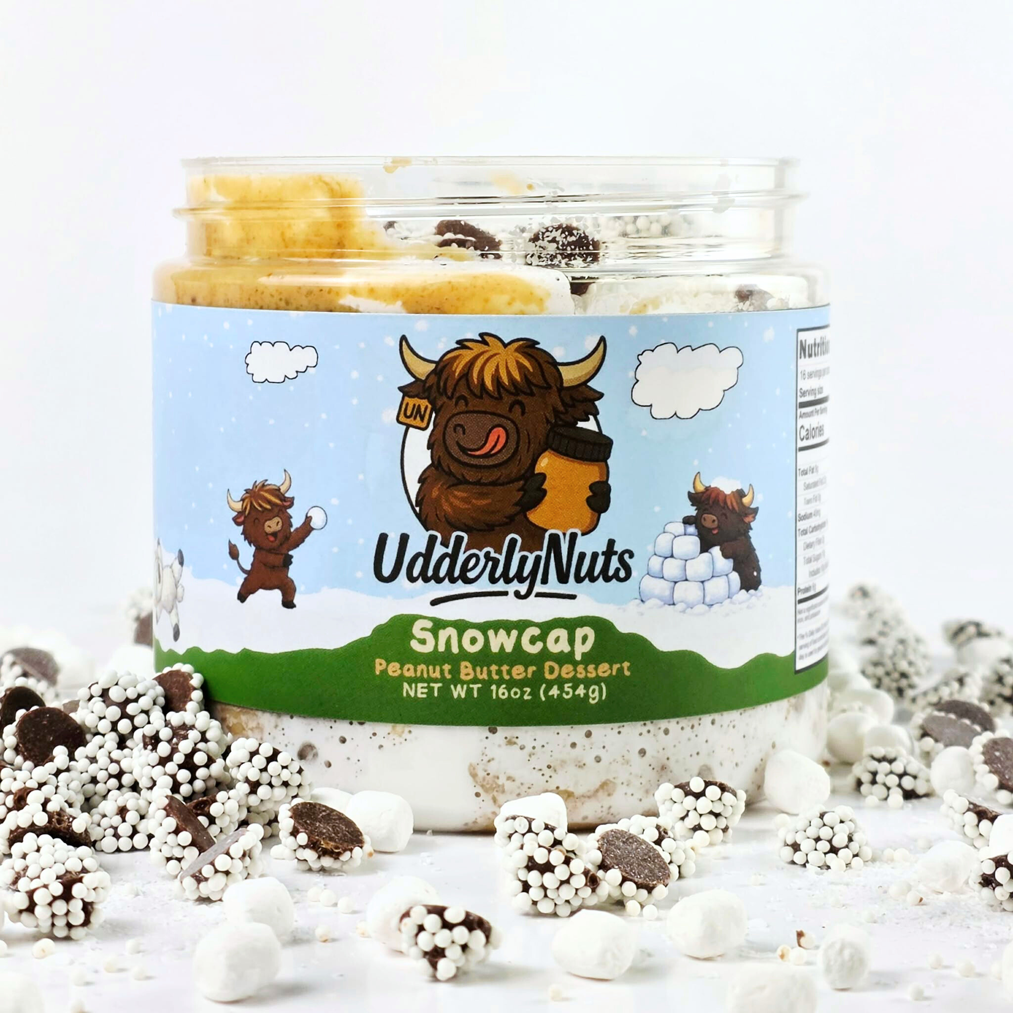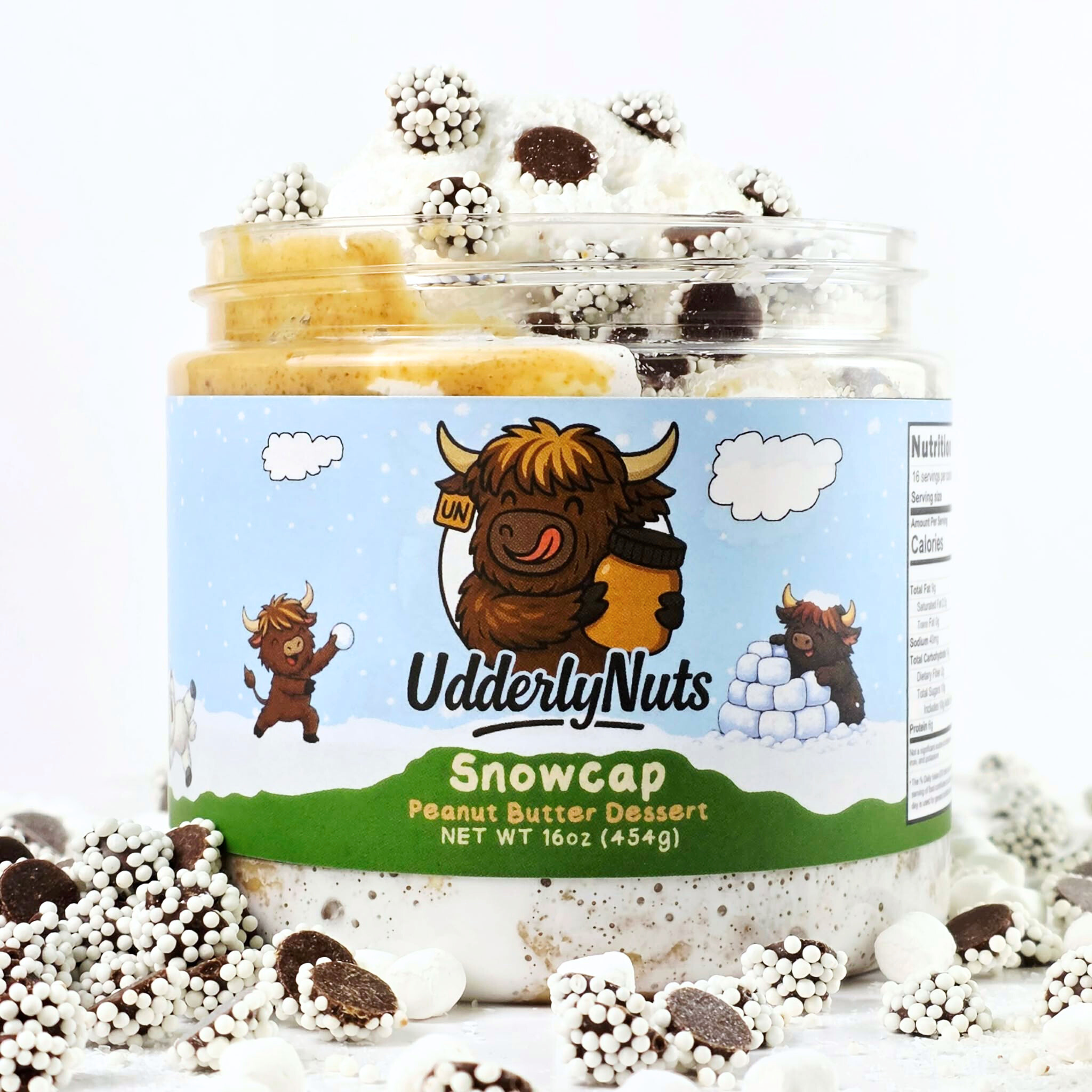 A delicious blend of white chocolate peanut butter and marshmallow fluff mixed with semi-sweet chocolate drops with white nonpareil sprinkles, mini marshmallows, and white sanding sugar.