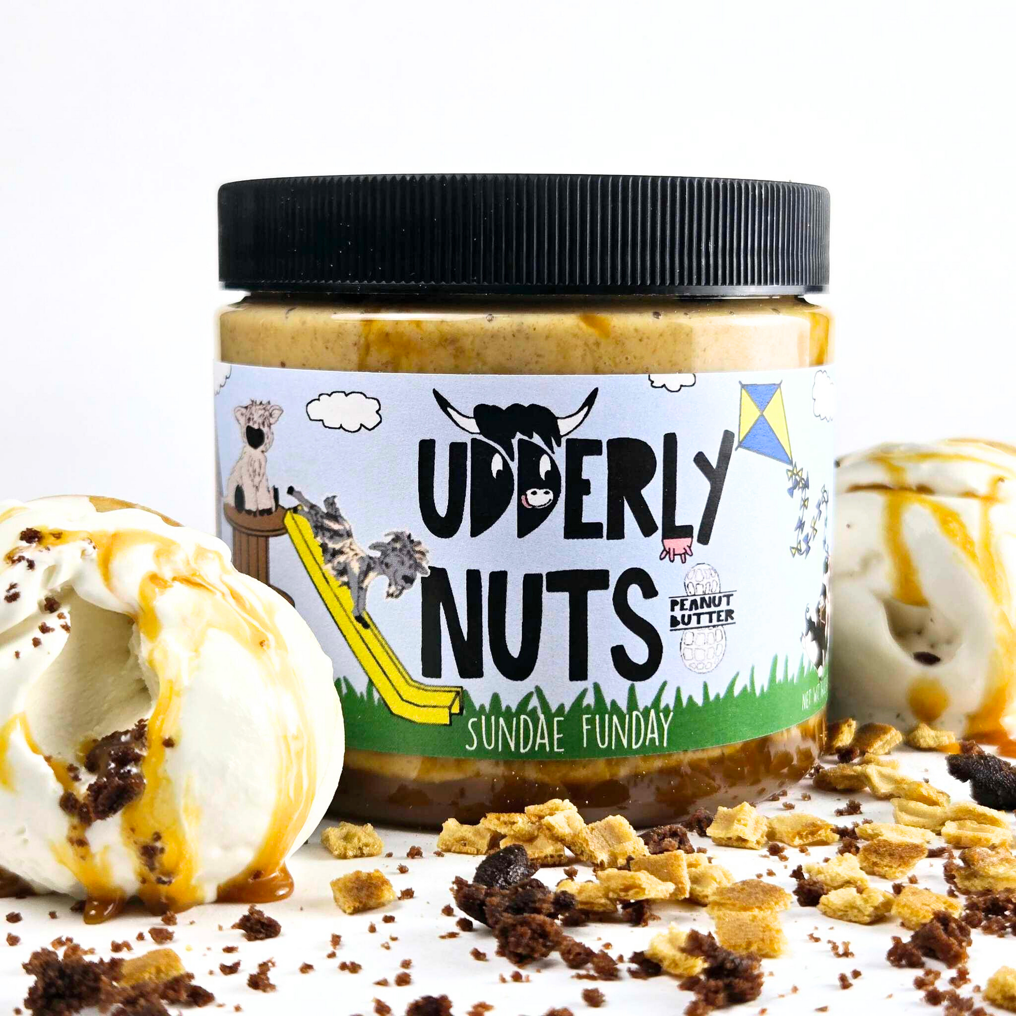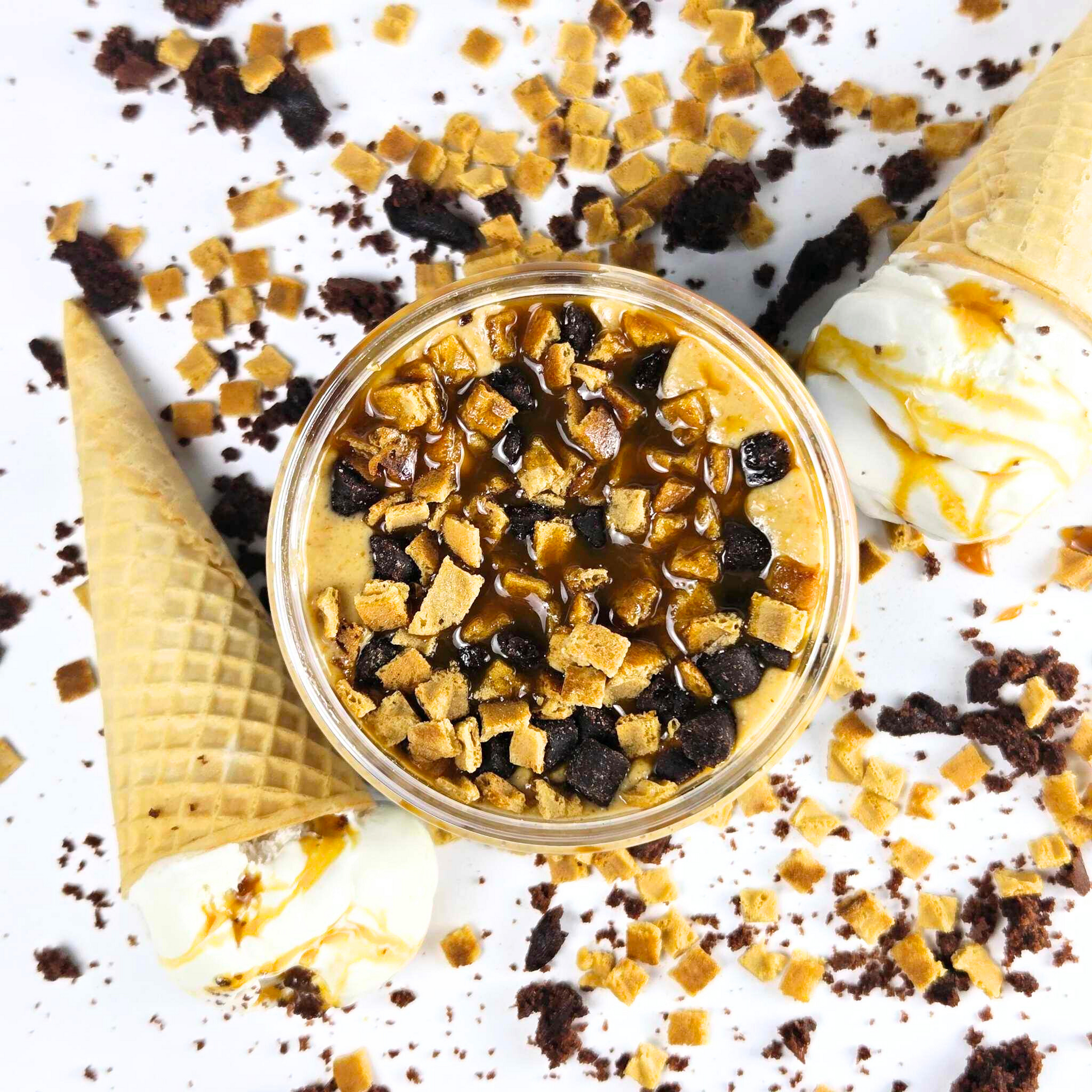 Our Sundae Funday combines a sweet white chocolate peanut butter base with swirls of caramel sauce, topped with fudge brownie bites and crispy waffle cone pieces. A decadent treat packed with texture and flavor in every spoonful.
