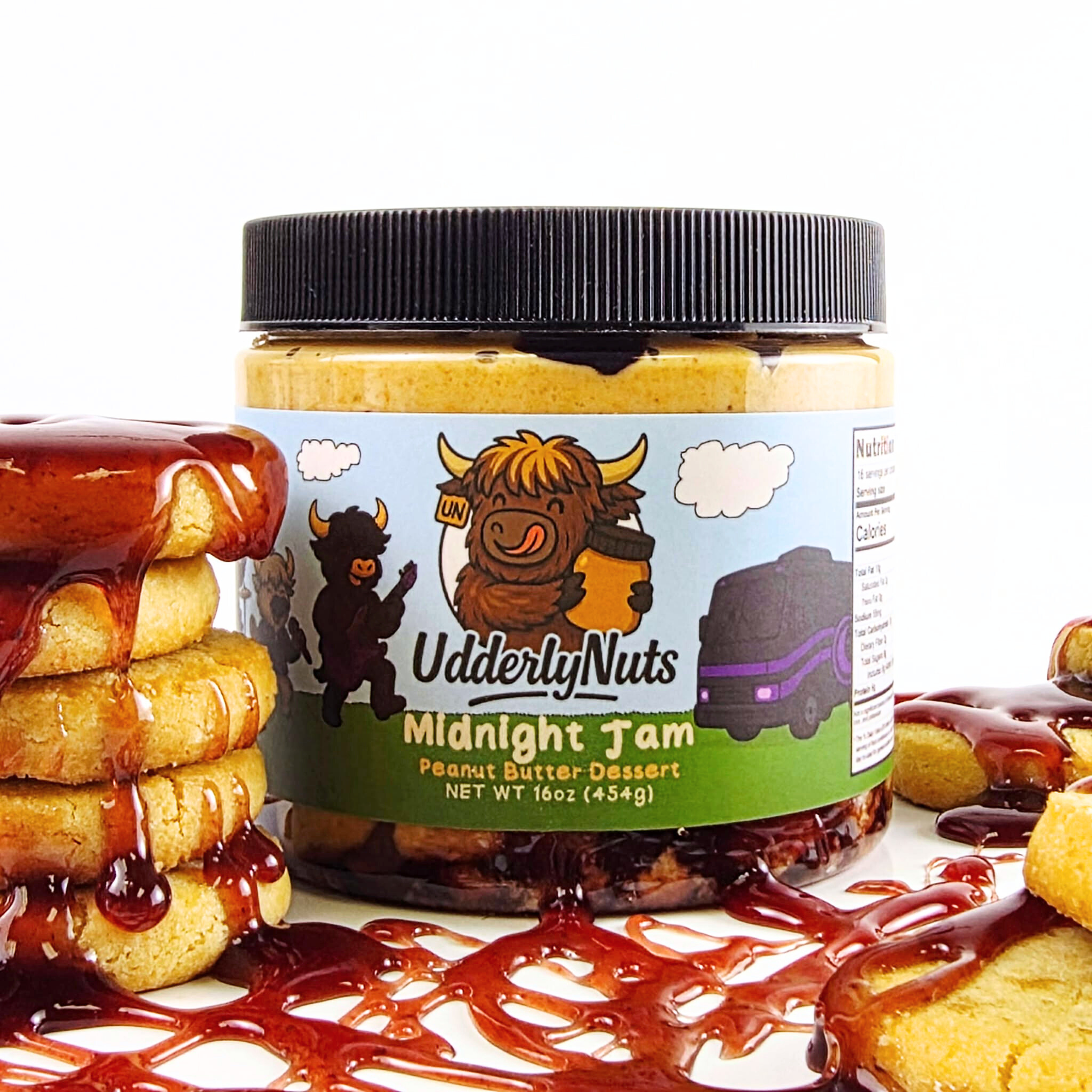 Indulge in Midnight Jam, a decadent blend of white chocolate peanut butter swirled with luscious blackberry sauce. Each bite offers a perfect balance of sweet and tangy, enhanced by marshmallow fluff and the satisfying crunch of buttery shortbread cookies.